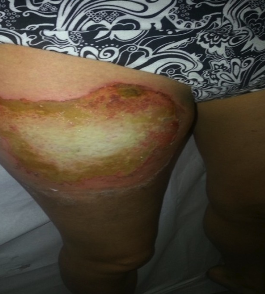 深達性II度熱傷からIII度熱傷と診断された彼女の右太腿の感覚は未だになく、今後も