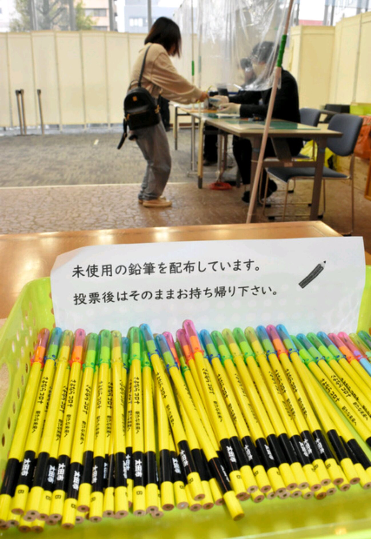 投票後はそのままお持ち帰り下さい」。群馬県太田市選挙管理委員会は、新型コロナウイルスの感染防止対策として、衆院選の投票用紙に記入する際に使う鉛筆を持ち帰ってもらっている。使い回ししないことで感染を防ぐ。