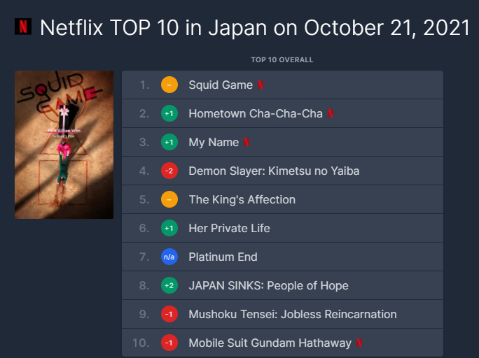 3名無し2021/10/22(Fri) 17:11:29ID:AwNDUzOTg(1/1)NG報告>>1오늘 일본 넷플릭스 TOP101위 - 오징어 게임 (한국드라마)2위 - 갯마을 차차차 (한국드라마)3위 - 마이 네임 (한국드라마)4위 - 귀멸의 칼날 (일본인의 자존심 애니메이션)5위 - 연모 (한국드라마)6위 - 그녀의 사생활(한국드라마)8위 - 일본침몰 (일본의 자랑 일본드라마)>>9>>11>>201