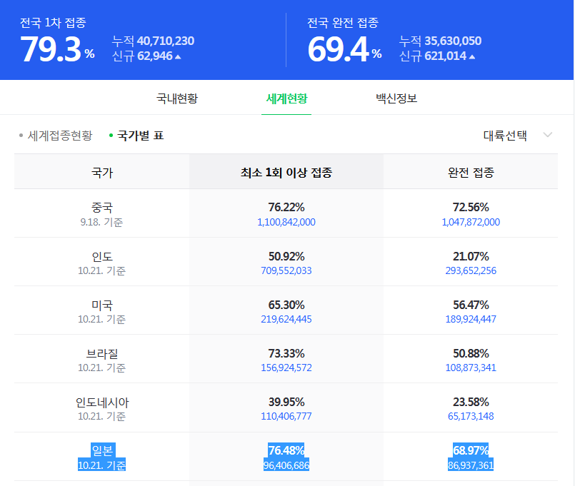 한국, 백신 완전 접종률도 일본을 추월