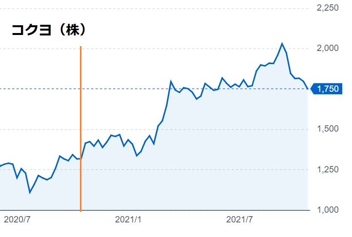 「ショウワノート」と資本提携をしている「コクヨ」の株価チャートを貼り付けます。