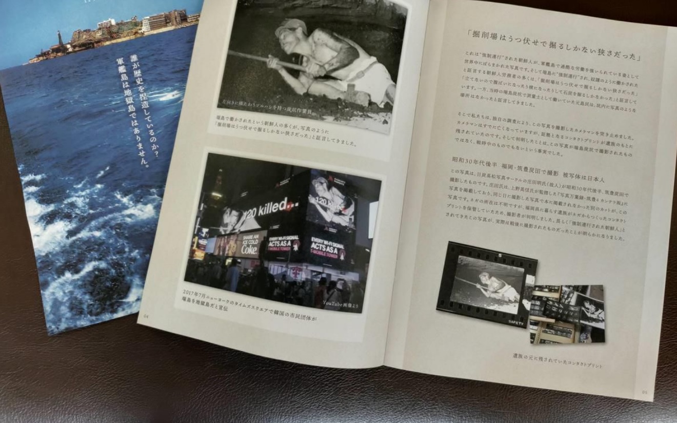 図は「軍艦島で強制労働させられている朝鮮人」の写真として、教科書に嘘が書かれていたことに抗議した冊子。