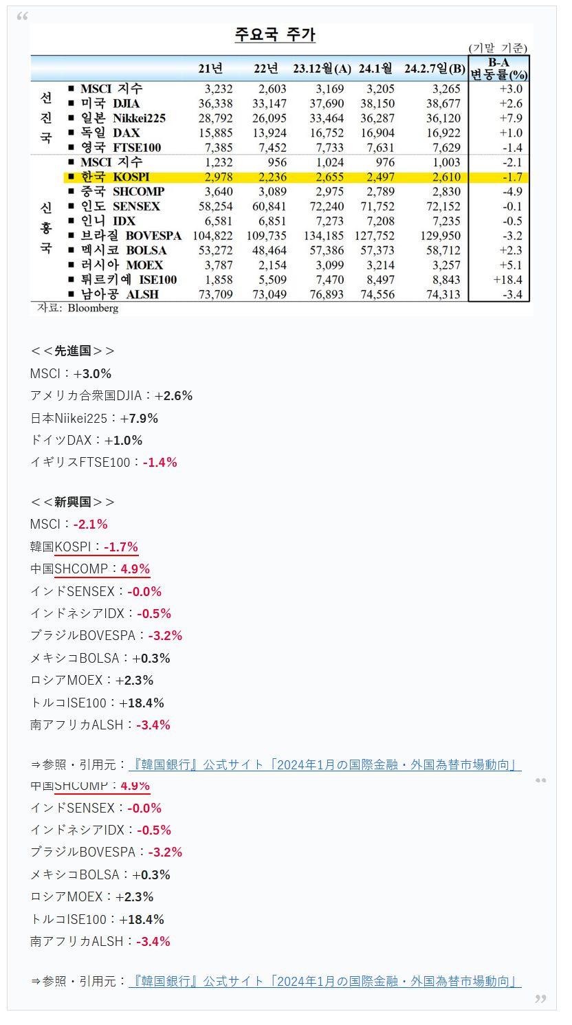 2024年02月13日、『韓国銀行』が「2024年1月の国際金融・外国為替市場動向」を公表しましたが、この中に「韓国の1人負け」状態が01月も変わらなかっとことを示すデータがあります。