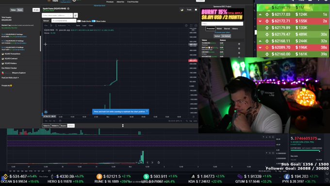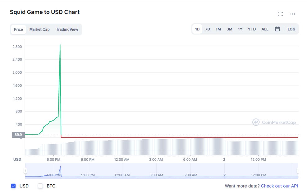 CNN은 1일(현지시간) 암호화폐 정보 사이트 코인마켓캡을 인용해 이날 한때 코인당 2861달러(약 337만원)까지 급등했던 가상화폐 ‘스퀴드’(오징어)의 가격이 5분 만에 0.00079달러로 떨어졌다고 전했다. 가상화폐 개발자가 이 코인을 모두 현금으로 바꿔 가치를 떨어뜨리는 일명 ‘러그 풀’(발밑의 카펫을 갑자기 잡아뺀다는 뜻) 사기를 저지르면서 벌어진 일이다. 사기 행각이 있기 직전까지 스퀴드의 시가총액은 200만 달러(약 23억6000만원)를 조금 웃도는 수준까지 올랐다고 한다.