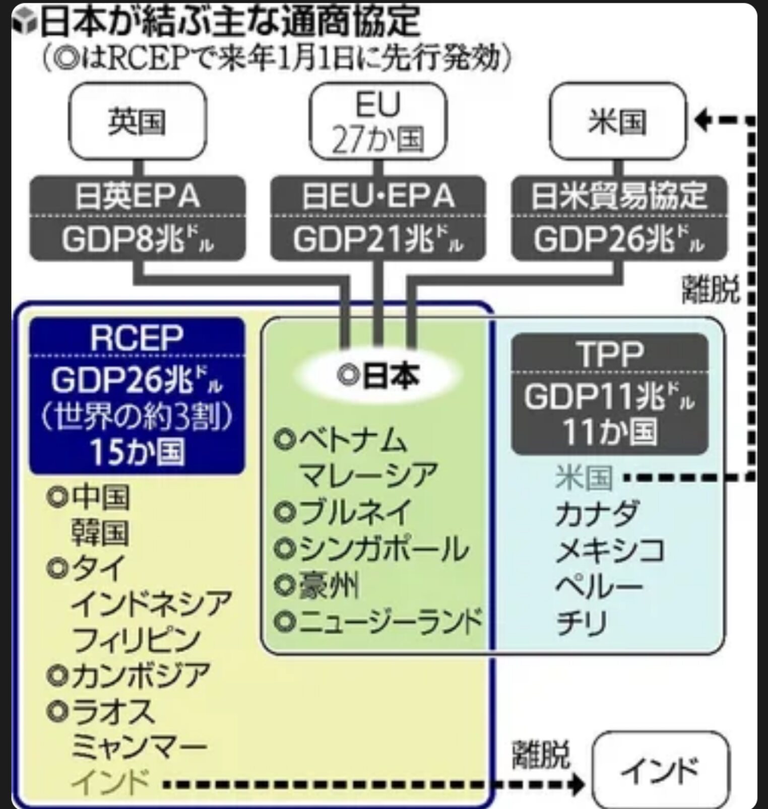日本や中国、豪州、タイ、ベトナムなど計10か国で発効した。遅れて批准した韓国の発効は2月1日になる。インドネシアなど4か国は手続きが完了していない。15か国の域内人口は約23億人、国内総生産(GDP)は約26兆ドルで、いずれも世界の約3割を占める。