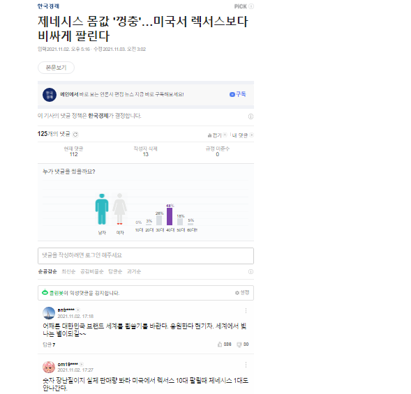 2021年11月2日、韓国メディア・韓国経済は「現代(ヒュンダイ)自動車の高級ブランド・ジェネシスの米国市場における平均販売価格が6万ドル(約680万円)を超え、競合ブランドのレクサスを抜いた」と伝えた。