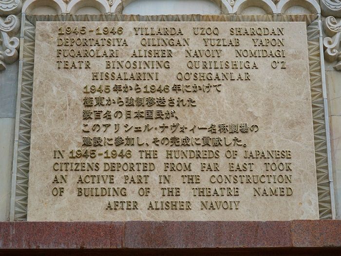 劇場に設置された石碑には、「1945年から1946年にかけて極東から強制移送された数百名の日本国民が、このアリシェル・ナヴォイー名称劇場の建設に参加し、その完成に貢献した。」とロシア語、日本語、英語、ウズベク語の4カ国語で刻まれている。