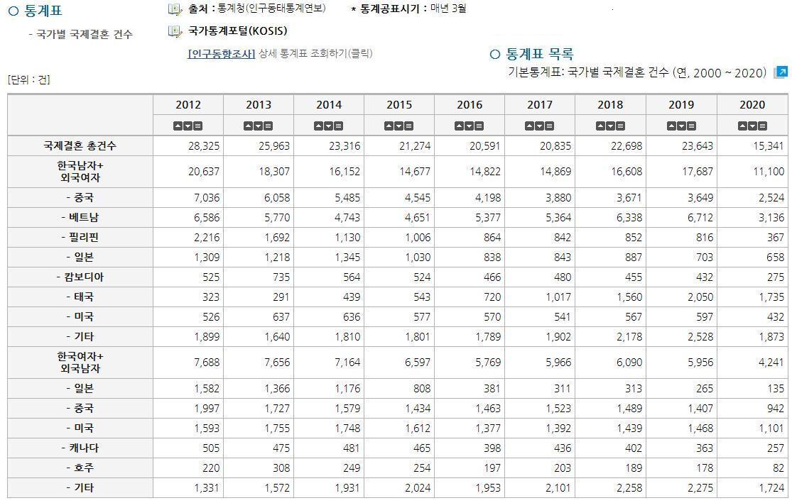 外国人及び帰化者の妻の出身国籍はベトナム(23.5%)、中国(21.7%)、タイ(10.7%)、日本(4.7%)、米国(2.9%)の順に多かった。2010年にはタイ女性との結婚は全体の1.3%に過ぎなかったが、10年間で8倍以上に増えた。同期間、中国女性が占める割合は33.1%から21.7%に減った。