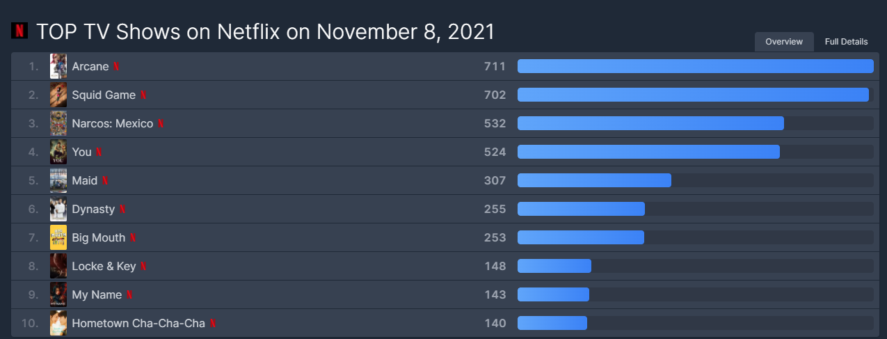 米国の動画配信コンテンツランキング集計サイト、フリックスパトロールが8日(現地時間)に明らかにしたところによると、『イカゲーム』はこの日、ネットフリックスのTVショー部門で、702点で2位となった。1位は711点を獲得したネットフリックスのオリジナルアニメシリーズ『アーケイン』だった。