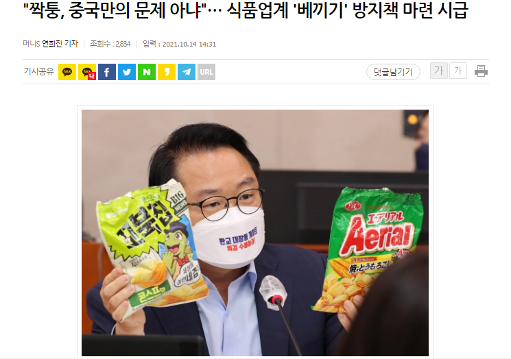 14日、国会農林畜産食品海洋水産委員会の安秉吉(アン·ビョンギル)国民の力(ククミン·ヒム)議員は、韓国農水産食品流通公社(aT)と韓国食品産業クラスター振興院を対象にした国政監査で、国内製菓業者の「味投製品」を指摘した。