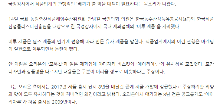 国政監査で食品業界の慣行的な'コピー'を防ぐ対策が必要だという声が出た。