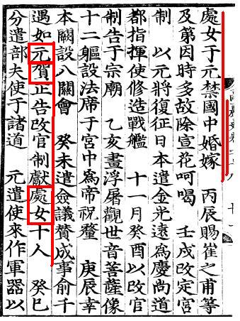 忠烈王元年冬(一二七五)十月、処女を元に献上する時期が近づいていたので、国中で結婚が禁止された(『高麗史』)。