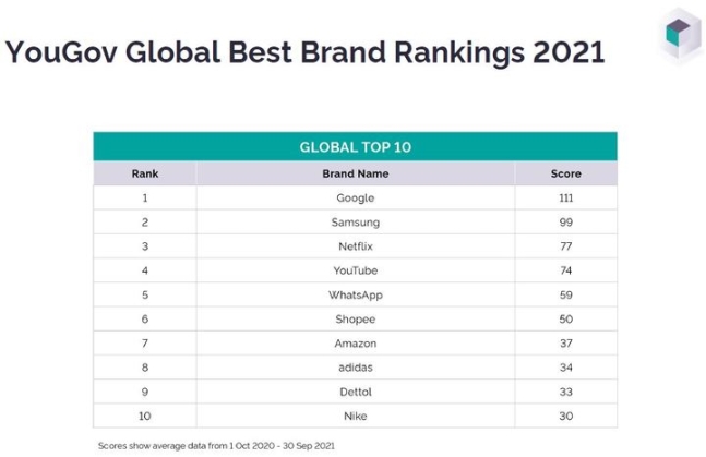 17일 유고브(YouGov)가 발표한 올해 브랜드 순위에서 삼성전자는 구글에 이어 2위에 올랐다. 삼성전자는 지난해 조사에서는 4위를 기록했으나, 올해 들어 2계단 도약해 역대 최고 순위를 기록했다.
