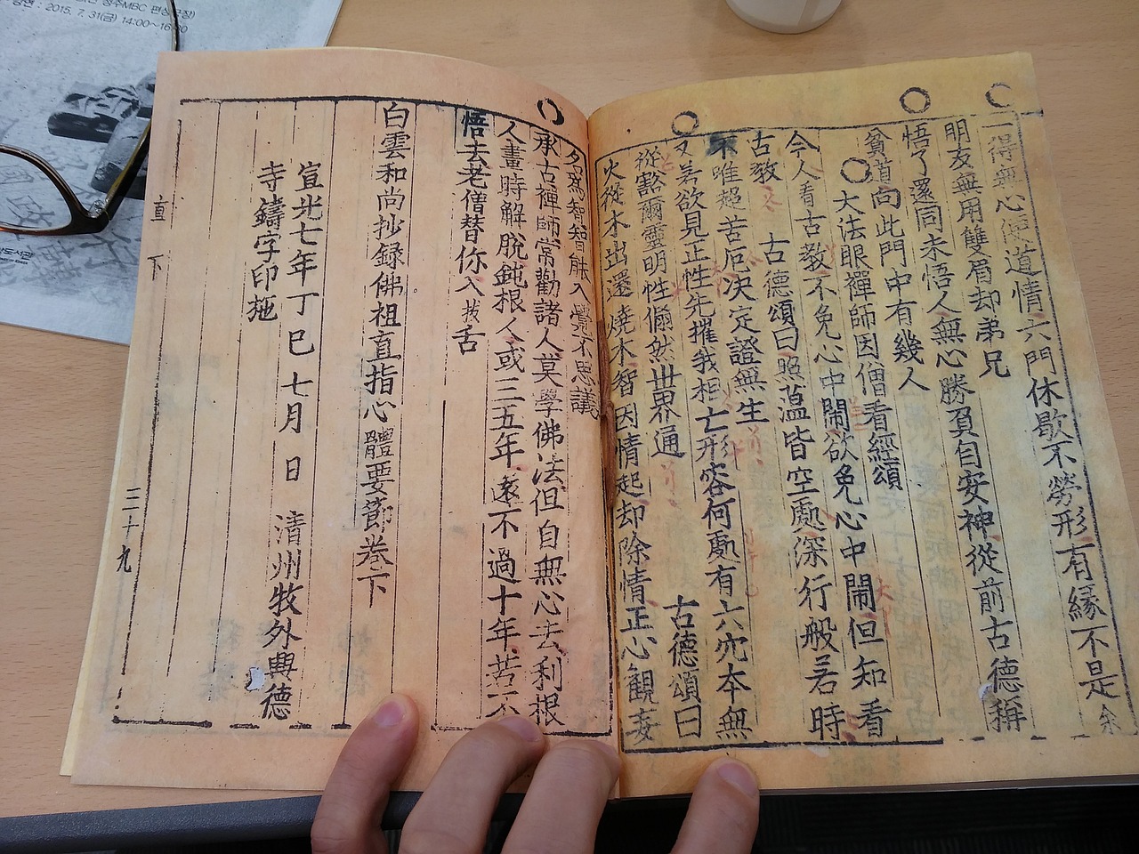 「直指心体要節」の原本は1886年初代に駐韓フランス公使に赴任したコランド・ブランシーが1880年代末~1890年代初めに韓国で蒐集し持ち帰ったものだ。その後、アンティークコレクターのアンリ・ベベルが買い取った後に、1952年にフランス国立図書館に寄贈された。