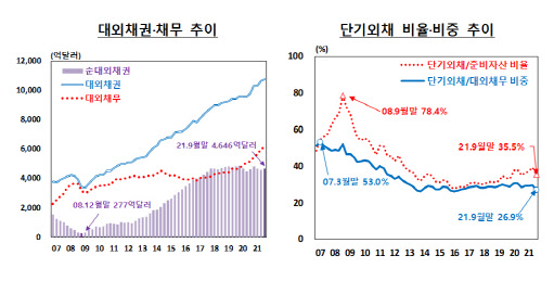 韓国銀行が18日に発表した「2021年9月末国際投資対照表(暫定)」によると、第1四半期の韓国の対外債務は6108億ドルで、前四半期より66億ドル増えた。対外債務のうち、満期が1年以下の短期外債が134億ドル減った1646億ドルを記録したが、長期外債は200億ドル増えた。