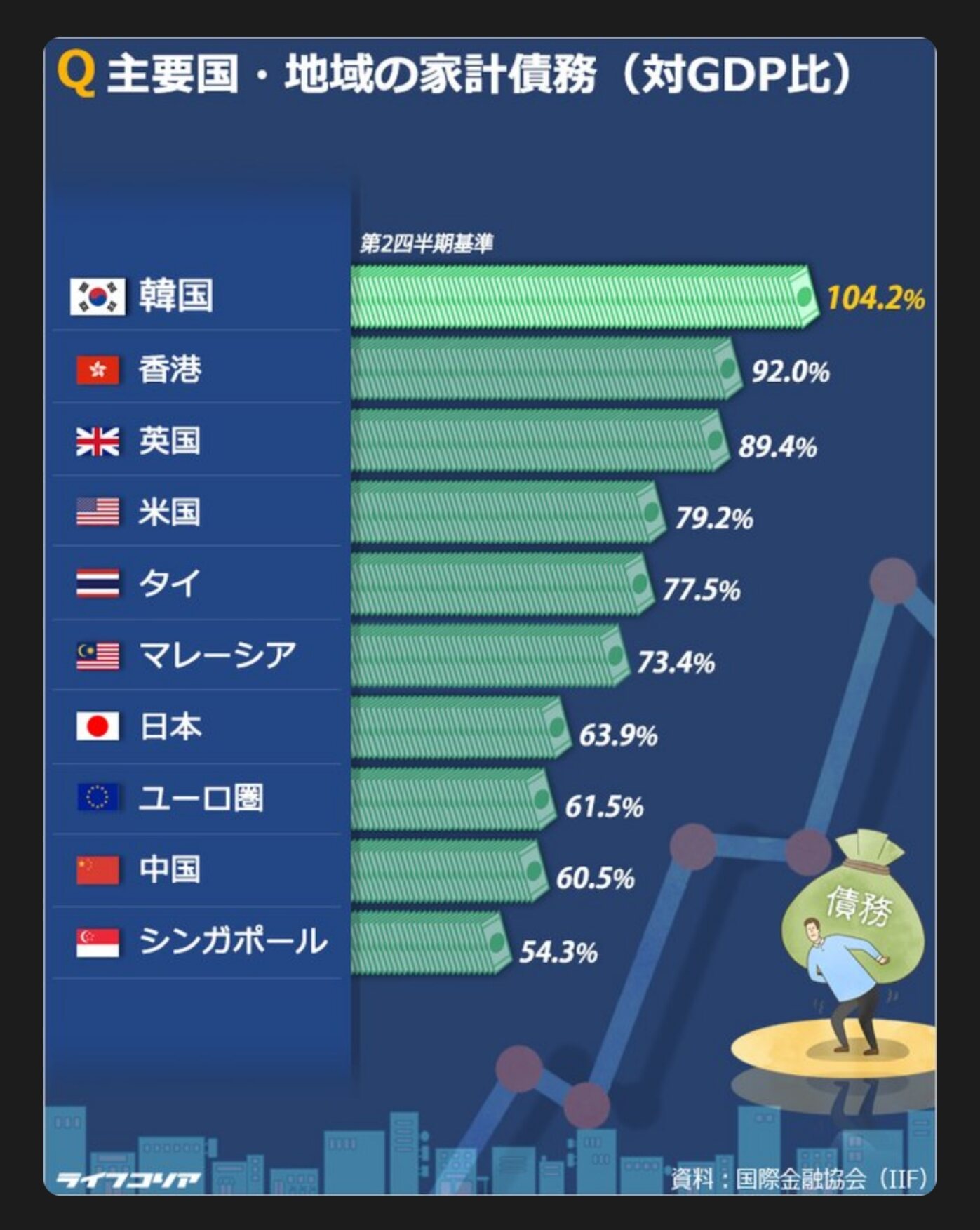 国際金融協会(IIF)の報告書によると、2021年第2四半期基準で世界37カ国・地域の対国内総生産(GDP)比の家計債務残高は韓国が104.2%で最も高かった。家計債務比率が104.2%ということは、家計債務残高の規模がGDPを超えていると理解すればよい。100%を超えた国は韓国だけだった。