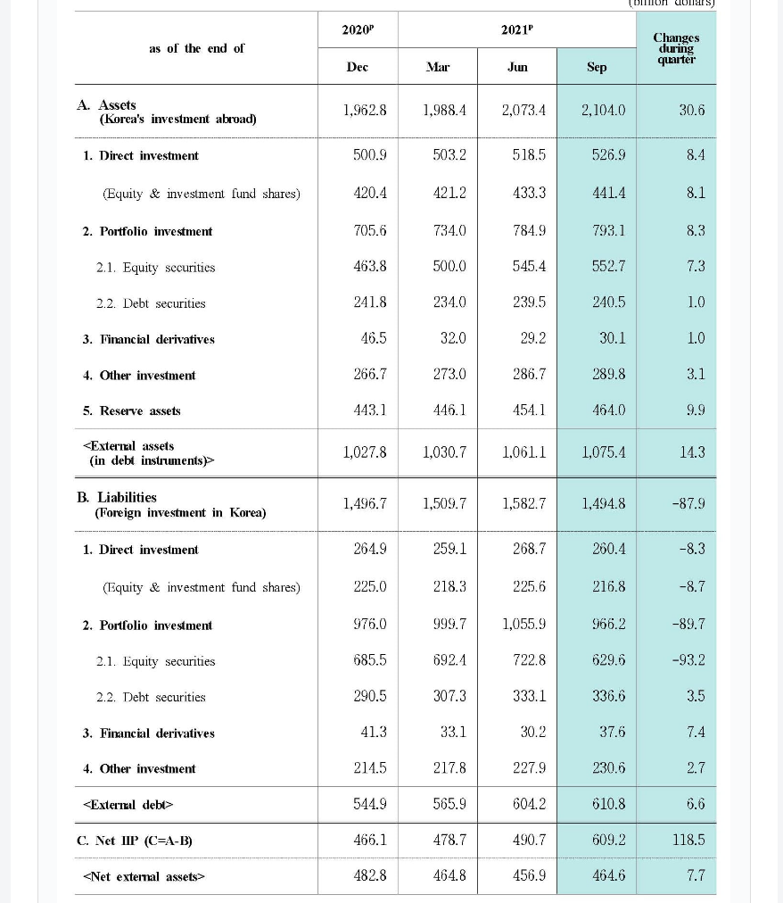 2021年11月18日、『韓国銀行』が、公表した2021年第3四半期時点での「International Investment Position」(対外資産負債残高:略称「IIP」の話だね
