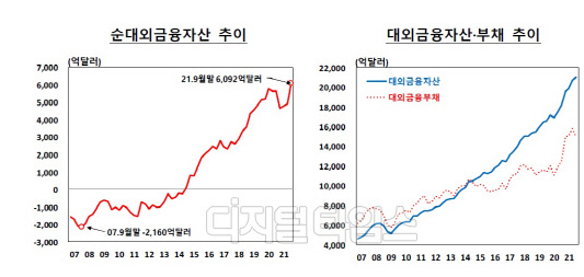 대외금융자산에서 대외금융부채를 뺀 순대외금융자산은 6092억달러로 지난 분기말인 6월말(4907억달러)보다 1185억달러 크게 증가했다. 역대 최대폭으로 증가한 것으로 순대외금융자산은 지난해 1·4분기(5783억달러) 이후 다시 역대최대치를 경신했다.