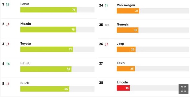 信頼度最下位ブランドはフォードの高級乗用車ブランド・リンカーン(28位)が名前を上げた。