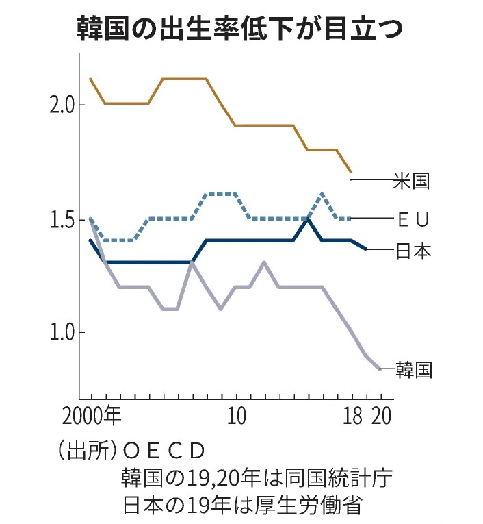 お隣の韓国が2020年、政府予想より9年早く、人口減少に転じた。同年の合計特殊出生率(1人の女性が生涯に産むと見込まれる子どもの数)は0・84。1970年の統計開始以来、最も低い水準だ。経済協力開発機構(OECD)加盟37カ国のうち1を下回っているのは韓国だけで、日本の1・36(19年)と比べても大幅に低い。「超少子化」の背景には何があるのか。韓国の少子化問題に詳しい早稲田大韓国学研究所招聘(しょうへい)研究員の春木育美さんに聞いた。
