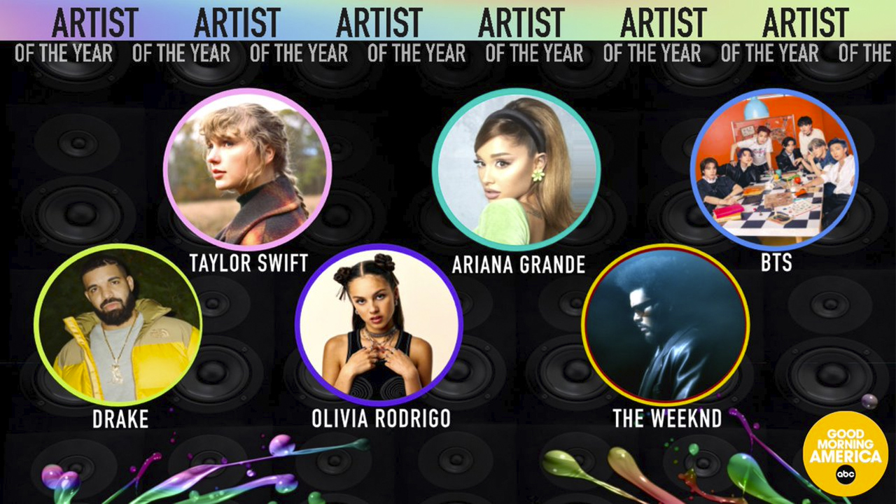 방탄소년단은 이날 미국 로스앤젤레스 마이크로소프트 시어터에서 열린 시상식에서 '올해의 아티스트' 부문 경쟁자였던 팝스타 테일러 스위프트, 아리아나 그란데, 올리비아 로드리고, 드레이크 등을 줄줄이 제치고 트로피를 거머줬다.