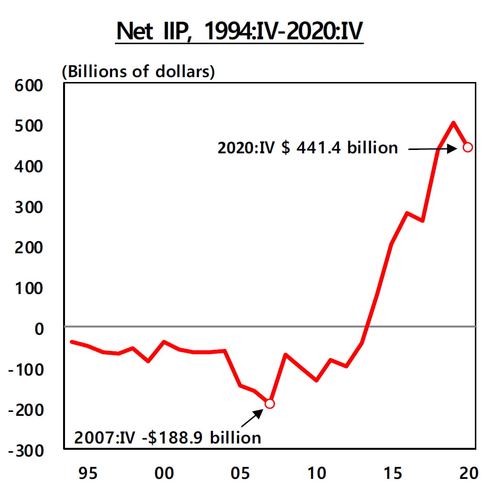 日本 経常収支+21兆円、海外資産 ±0兆円、差引+21兆円 (海外純資産 347兆円)