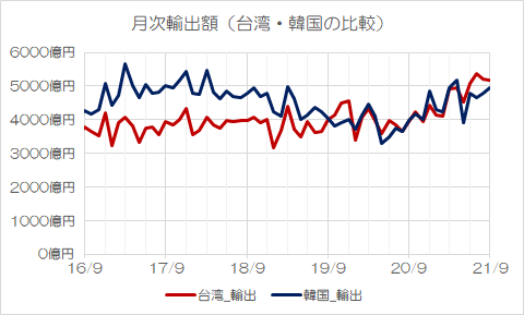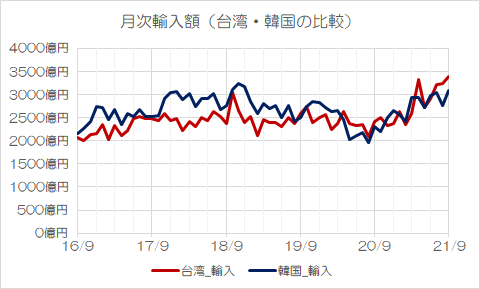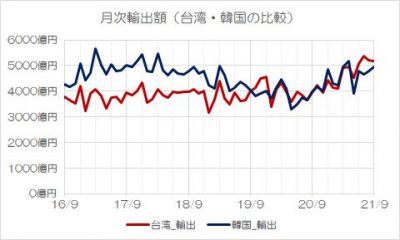 2021年9月の貿易統計において、日本の貿易相手国として、韓国に代わり台湾が第3位となった。