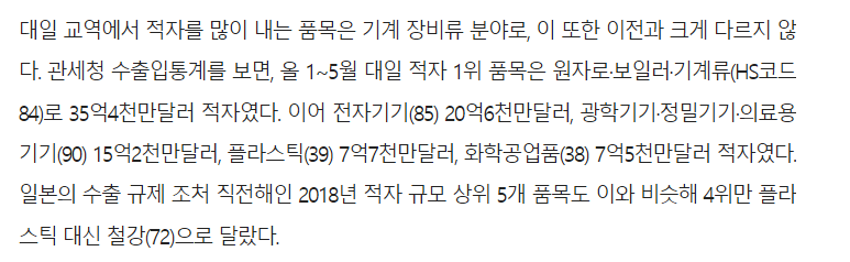 関税庁輸出入統計を見ると、今年1-5月対日赤字1位の品目は原子炉·ボイラー·機械類(HSコード84)で35億4千万ドルの赤字だった。 続いて電子機器(85)20億6千万ドル、光学機器·精密機器·医療用機器(90)15億2千万ドル、プラスチック(39)7億7千万ドル、化学工業品(38)7億5千万ドルの赤字だった。 日本の輸出規制措置直前の18年の赤字規模上位5品目もこれと似ており、プラスチックではなく鉄鋼(72)が4位に過ぎなかった。>>1