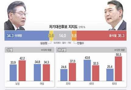 東亜日報·R&R、 尹41.7% 李37% 安10.1% 10.1% …4.7% 差