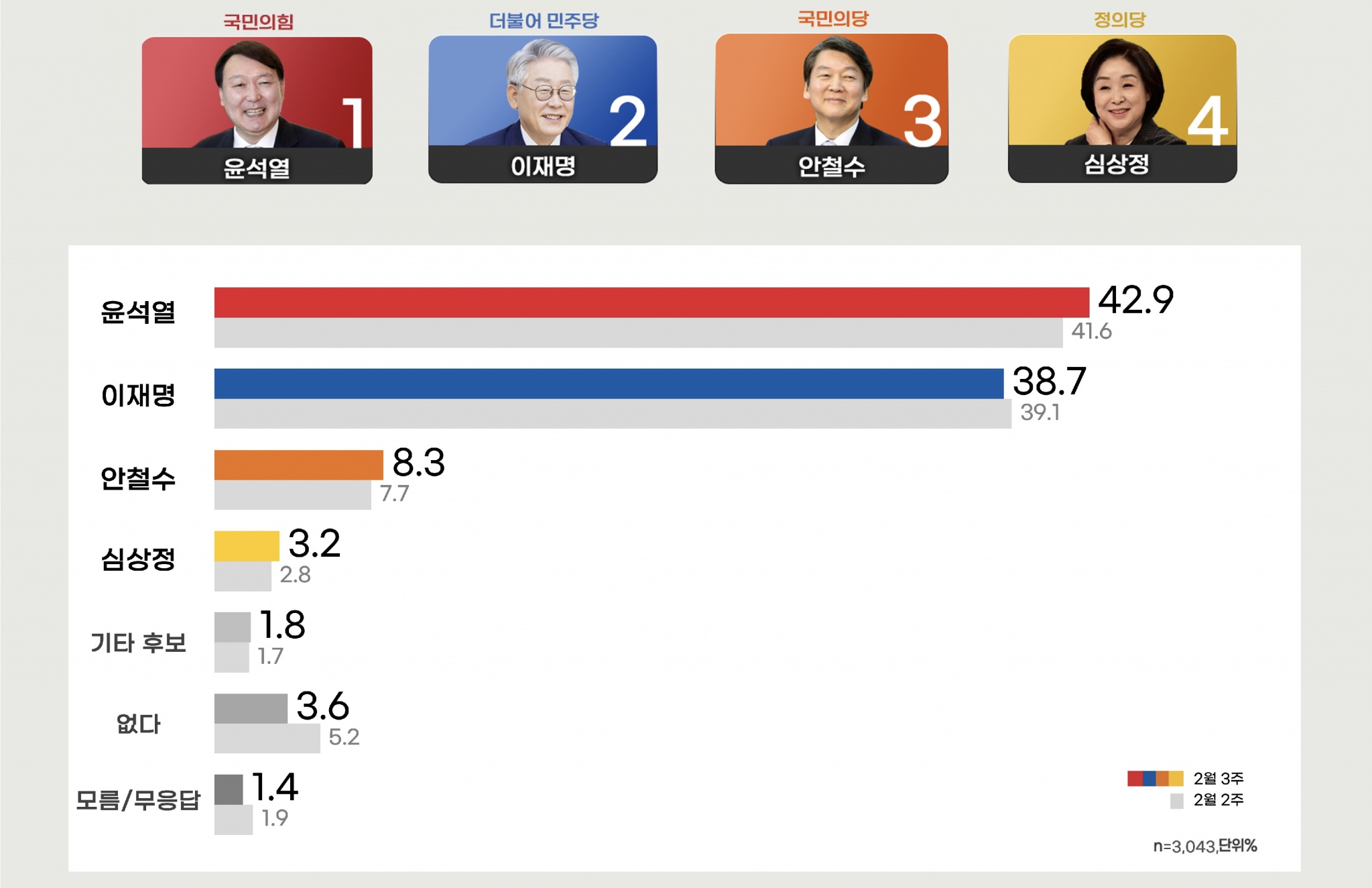 ニューシス·リアルメーター、尹43.3%李41.8%…1.5%p差