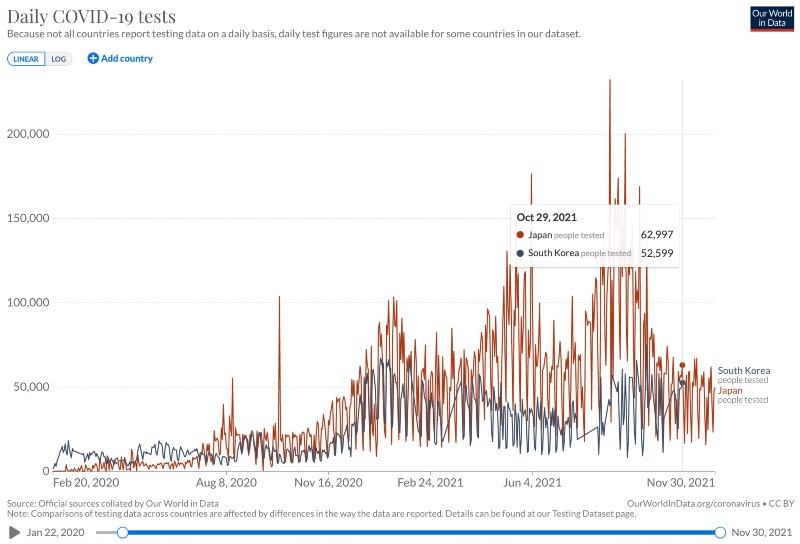 ↓日韓検査数比較韓国では世界でも類を見ない大規模感染拡大を起こし、医療崩壊と膨大な死者を出して社会が崩壊している。