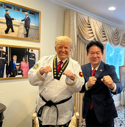 이동섭 국기원장은 20일 트럼프 전 대통령의 별장인 미국 플로리다 팜비치 마러라고 리조트를 방문해 트럼프 전 대통령에게 명예 9단증과 태권도복을 전달했다. 이 원장은 “트럼프 전 대통령이 평소 태권도에 남다른 애정을 갖고 있는 것으로 안다”며 “앞으로 태권도와 국기원에 많은 관심과 협력을 부탁한다”고 밝혔다. 이 원장의 이번 방문은 현지에 사는 미국 교포의 주선으로 이뤄진 것으로 알려졌다.