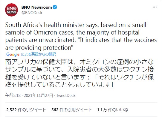 一方、南アフリカの保健当局は26日、「ワクチンが効果的ではないという兆候はまだなく、今後も状況を注視する必要がある」と警戒を呼びかけました。