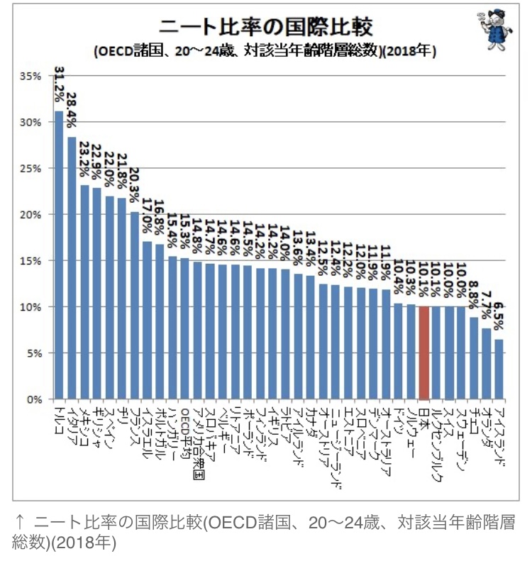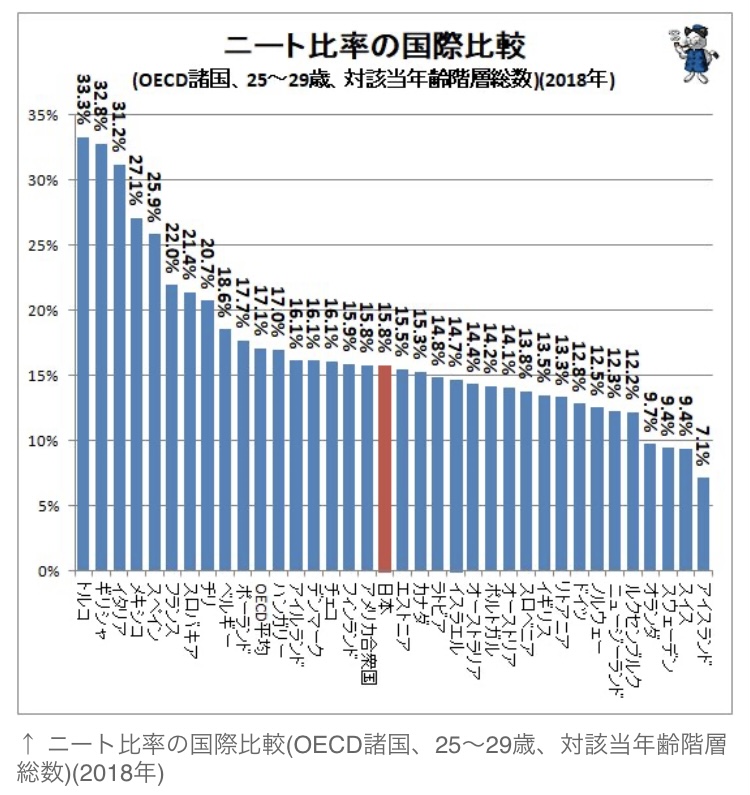 専門家は、自己主導的な生き方と自己実現を重要視するMZ世代の特性によって、金銭的補償と適性、興味を満たす働き口を好む半面、安定性は重視しない人が増えていると分析している。日本と韓国に限らず、世界的に増えてるからな、ニート