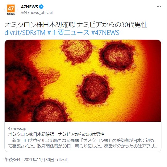 https://news.yahoo.co.jp/articles/cf1f1fccf3c2cb291a649e4dc29e895dbd43e83b感染が分かったのはアフリカ南部のナミビアから28日に成田空港に到着した30代男性。入国時の検査でウイルス陽性と判定され、ゲノム(全遺伝情報)解析しオミクロン株感染が判明した。