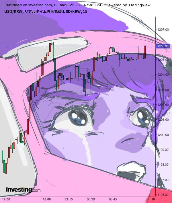 一晩明けて、結局1205KRW/USDから相場が始まる。