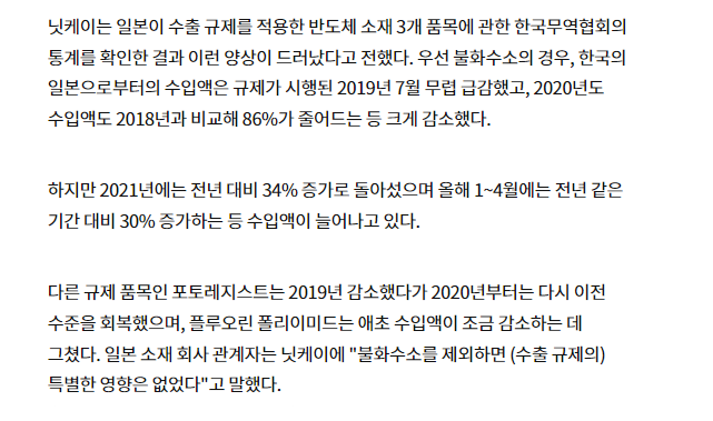 同紙は日本が輸出規制を適用した半導体素材3品目に関する韓国貿易協会の統計を調べた結果、こうした状況が確認されたと伝えた。まずフッ化水素の場合、韓国の日本からの輸入額は規制が施行された2019年7月ごろ急減し、2020年度の輸入額も2018年と比較して86%減となるなど大きく減少した。しかし2021年には前年比で34%増となり、今年1-4月には前年同期比30%増加するなど輸入額が増えている。