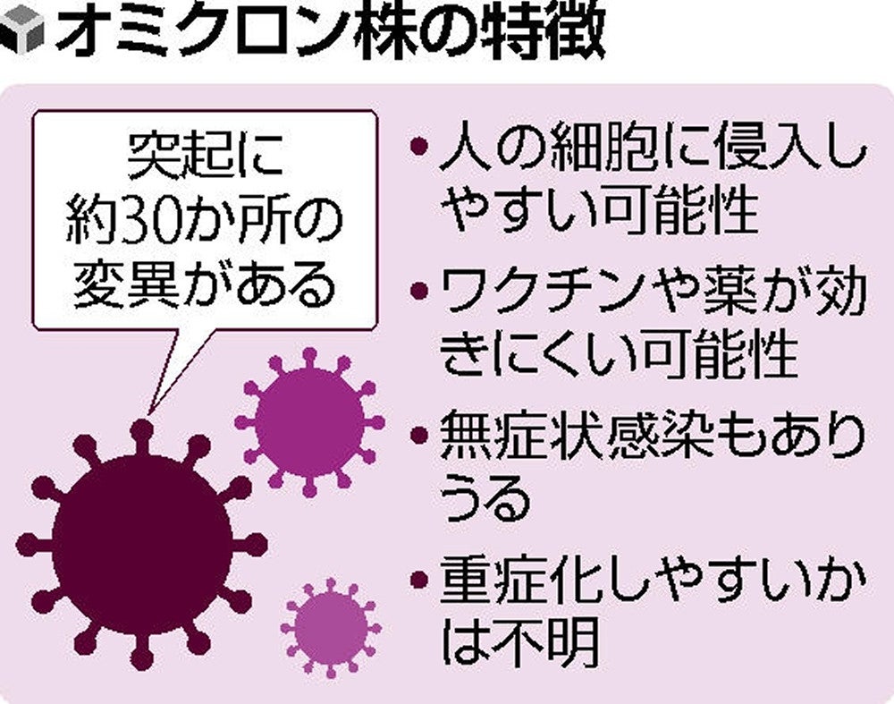 オミクロン株は、従来の変異株と比べて突起部分の変異が数倍多い。感染力が高い英国由来のアルファ株や、インド由来のデルタ株などにも見られた変異も併せ持つ。専門家は、今夏の第5波で猛威を振るったデルタ株以上に感染力が強まったり、ワクチンや治療薬の効き目が弱まったりすることを懸念している。>>3