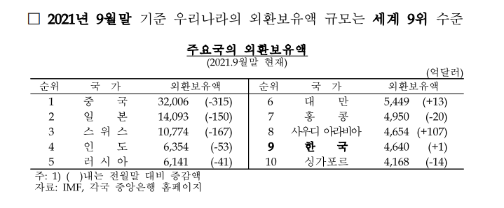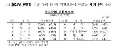 韓国の外貨準備高は11月末現在、世界9番目の規模。1位は中国(3兆2224億ドル)、2位は日本(1兆4058億ドル)、3位はスイス(1兆826億ドル)だった。- 61