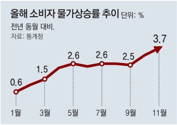 統計庁は2日、「11月の消費者物価動向」によると、先月の消費者物価指数は109.41で、前年同期比3.7%上昇したと発表した。これは2011年12月(マイナス4.2%)以降最大の上げ幅で、今年に入っても最高値だ。消費者物価は、10月も3.2%上昇した。2カ月連続で3%台の上昇は、2012年1月と2月以降9年ぶりのことだ。石油類と個人サービス、農畜水産物などの価格が一斉に値上がりし、物価を押し上げた。