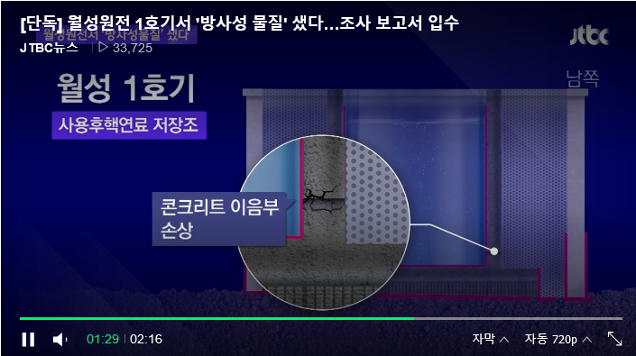韓水原の報告書「月城原発敷地内の地下水のトリチウム管理の現状および措置計画」によると、韓水原は昨年4月に月城原発3号機のタービン建屋下部の地下水排水路(タービンギャラリー)のマンホールに溜まった水から、1リットル当たり71万3000ベクレルのトリチウムを検出した。 この排水路は放射性物質の排出経路ではない。71万ベクレルは、原子力安全委員会(原安委)が定めた排出可能排水路に対して定めた管理基準(4万ベクレル/リットル)の17.8倍にのぼる高濃度だ。b(\/)d