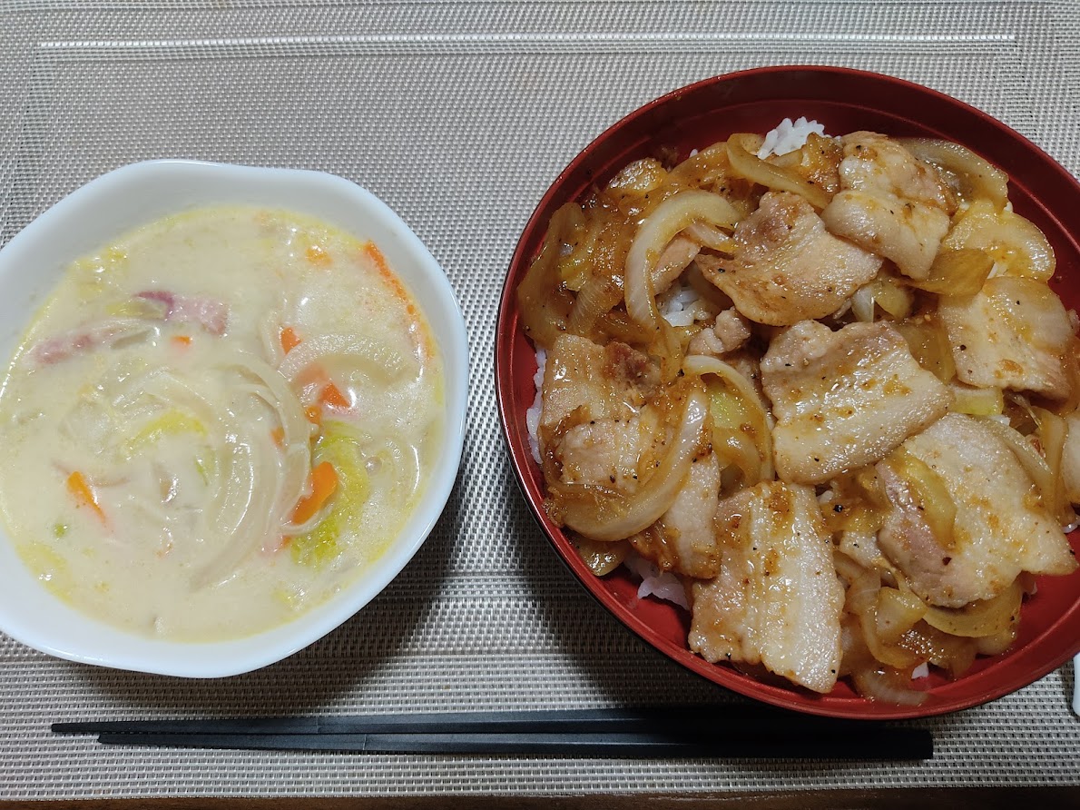 豚バラの焼き肉丼、豆乳スープニダ
