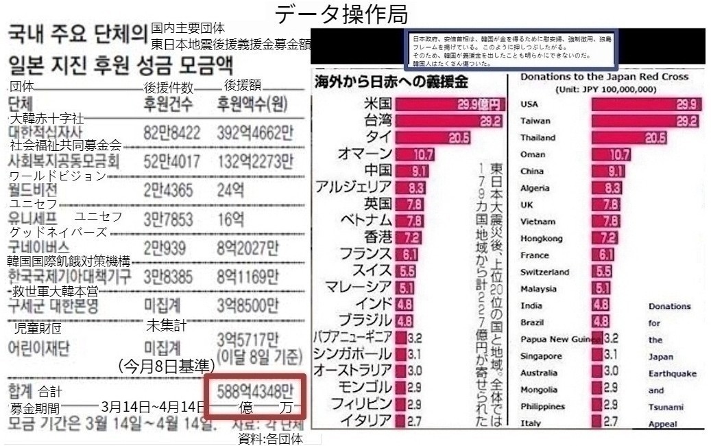 ま、大韓民国人が日本を助けようとした理由は、震災で困っている日本に金を恵んでやれば、尻尾を振って大韓民国に屈服して何でも言うことを聞くと信じていたからで、純粋な善意ではないけどね。