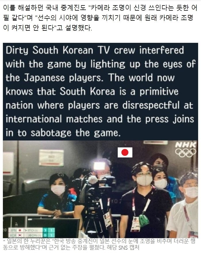 올림픽 탁구경기에서 한국인들이 일본 선수를 눈부시게 했다. 또 거짓말.. 촬영은 일본인만 할 수 있다.