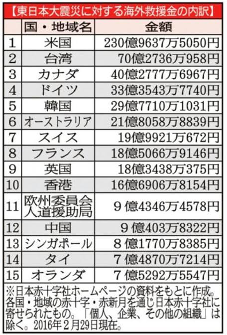 東日本大震災で大韓民国は日本に対して、救援金約29億7700万円の他に、義援金約2億1200万円が送られてきている。