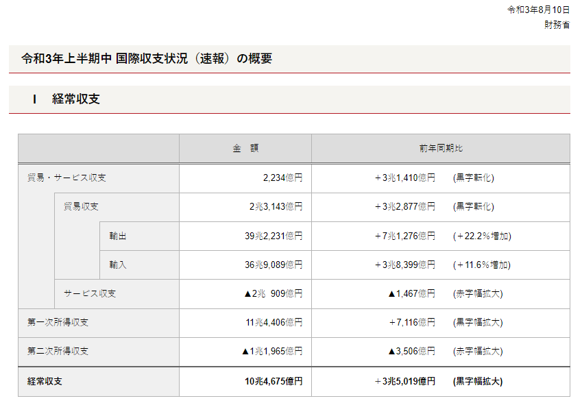 ①2021年度上半期(1~6月)の経常収支、黒字10兆4,675億円…前年同期比50.3%増