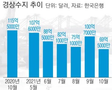 >韓国..10月の経常収支は69億5000万ドル(約7900億円)の黒字だった。