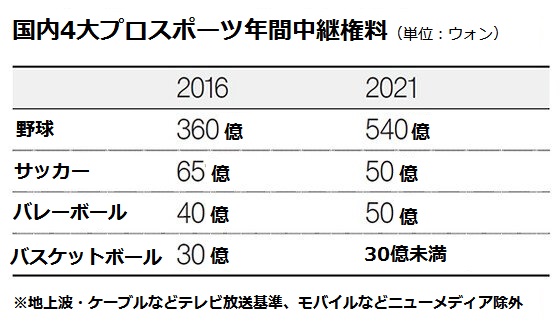 中継権は2019年当時の年65億ウォンより減った年50億ウォン程度とされている。