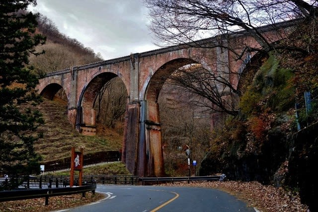 レンガ造りのトンネルに施設、下の写真のような眼鏡橋、その他、鉄道関係の遺構も残り、紅葉や新緑の季節はハイカーで賑わう
