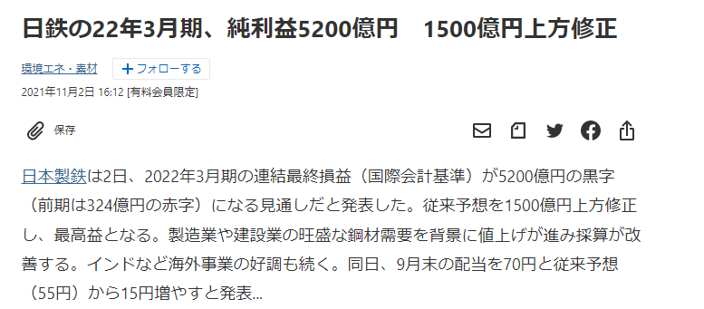日本製鉄の22年3月期、純利益5200億円URL を追って行った先。